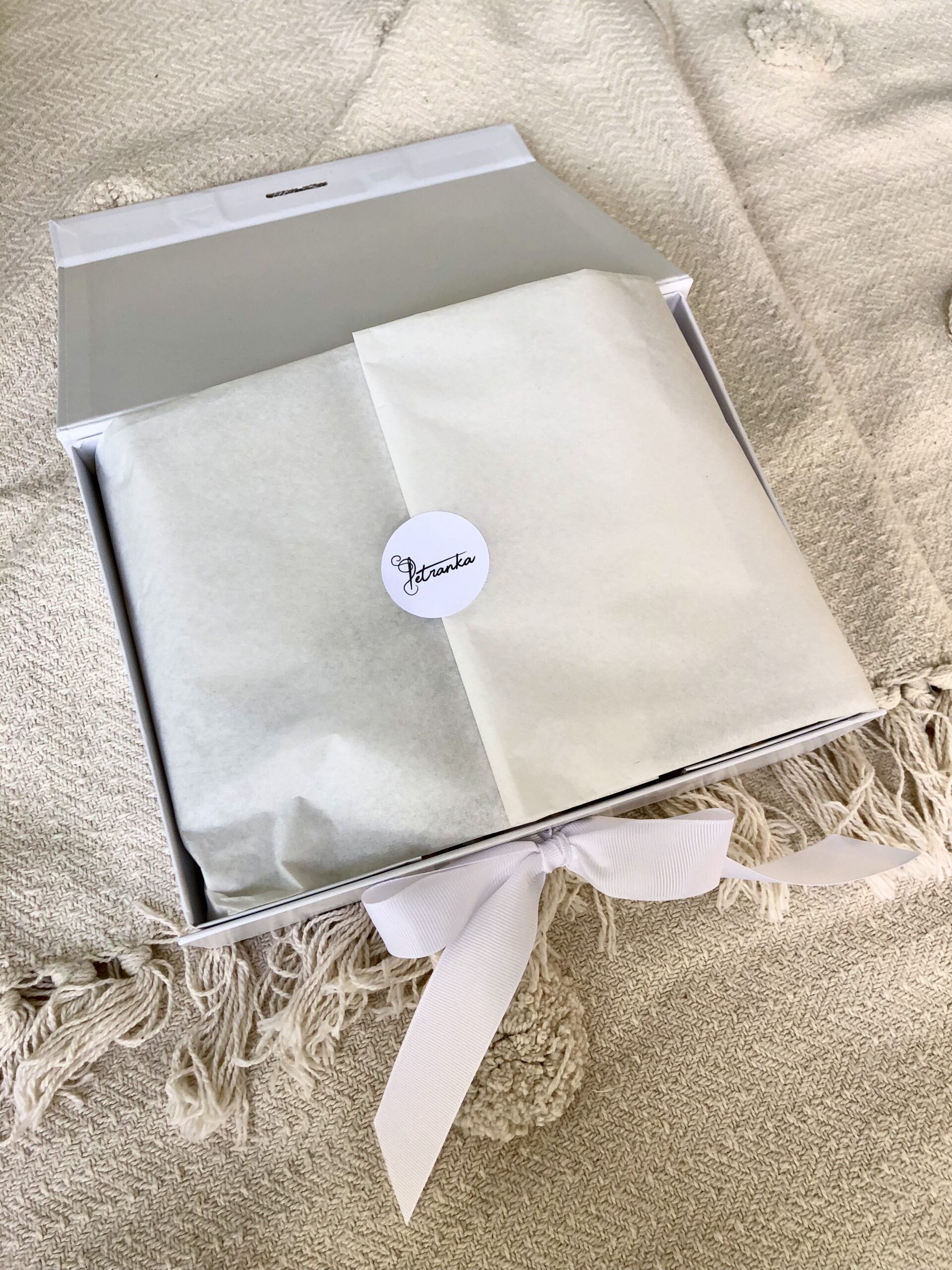 Darčekový box sa skladá z bielej luxusnej krabičky veľkosti 23x17x7 cm a obsahuje šperkovnicu, obal na cestovný pas a štipec. Vyber si z troch farieb darčekov – bielej, čiernej alebo ružovej. Pokojne si farby namixuj podľa vlastného želania. Farbu nápisu vyrobím v bielej, čiernej, striebornej, zlatej alebo medenej farbe. Text nemusí byť iba meno, ale napríklad aj motto – podľa tvojho uváženia. Meno vyhotovím taktiež aj na vonkajšiu časť krabičky. Krabičku môžeš opakovane použiť, keďže je z pevného materiálu. Zatvára sa pomocou magnetu a stuhy.