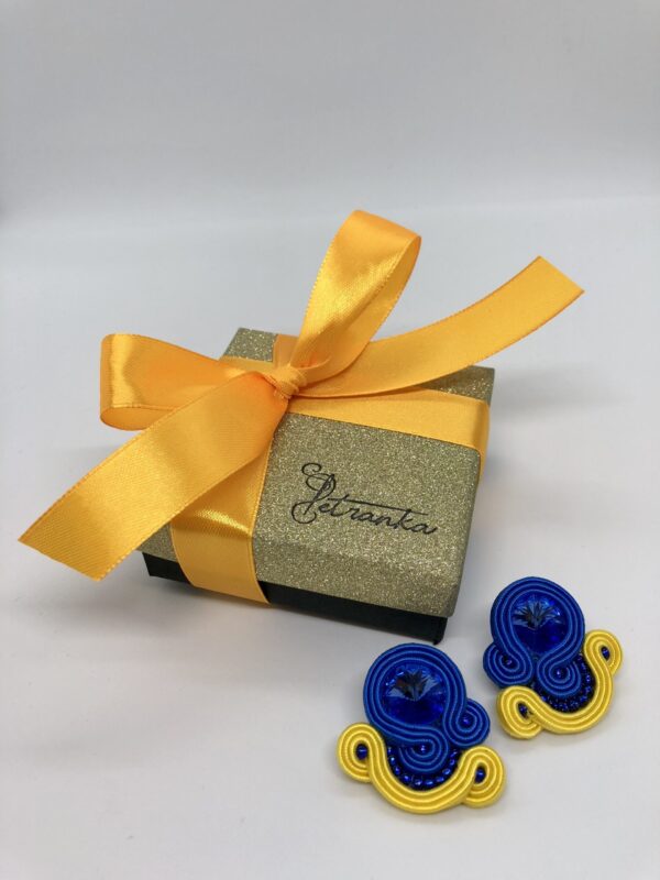 Náušnice sú vyrobené z kvalitnej modrej a žltej šujtašky, swarovski kryštálov, korálok japonskej značky TOHO a zapínanie je zo striebra. Sú veľmi ľahké, ideálne teda aj na bežné nosenie.