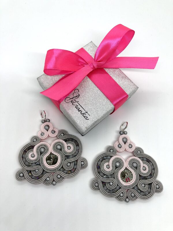 Náušnice sú ručne šité z kvalitnej ružovej a sivej sutašky, korálok a swarovski kryštálov. Zapínanie je zo striebra. Zadná strana je podlepená.