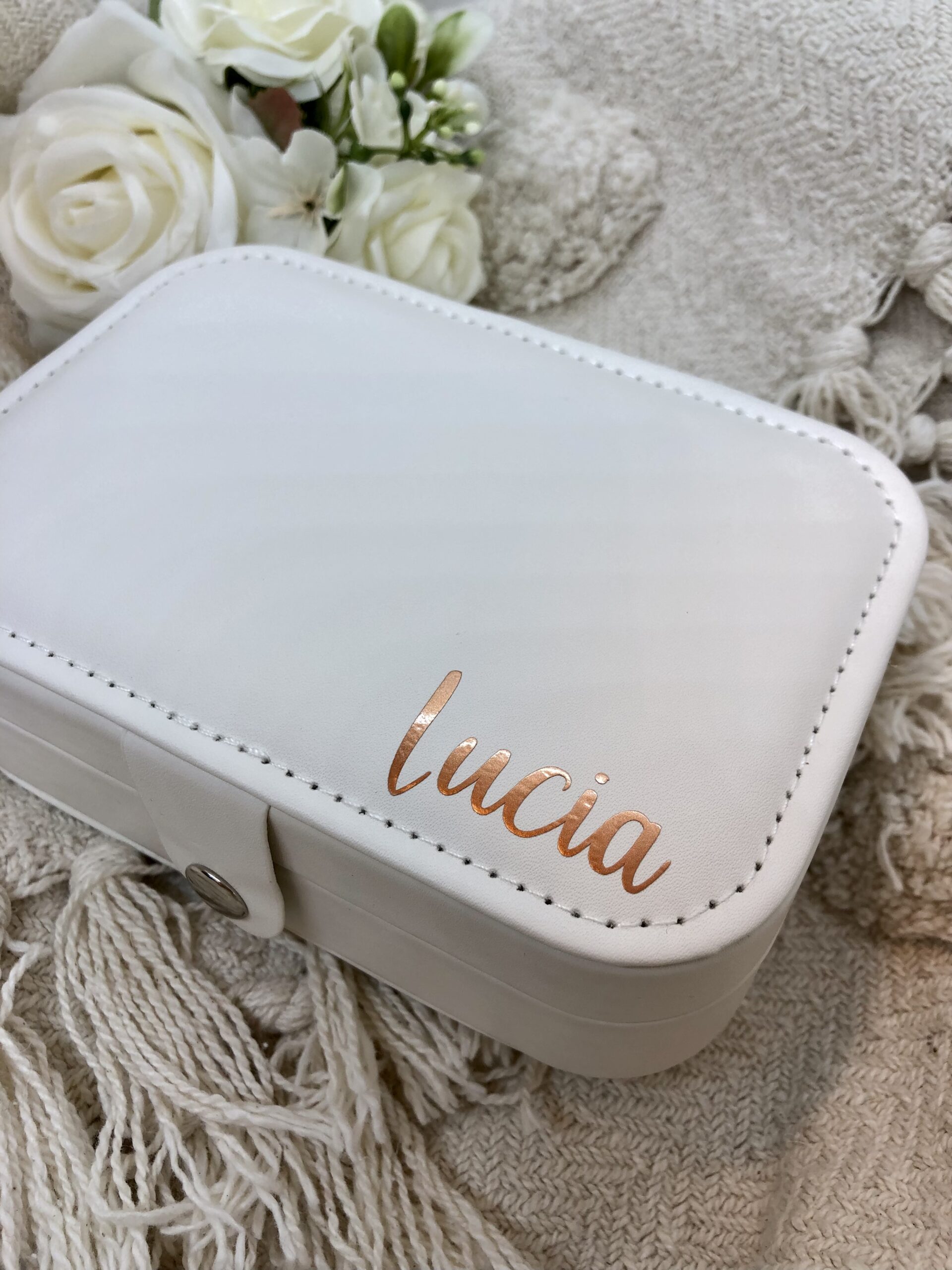 Personalizovaná šperkovnica je roztomilým darčekom pre vaše kamarátky, družičky alebo kohokoľvek, kto má rád svoje šperky zorganizované. V šperkovnici je miesto pre 5 náhrdelníkov alebo náramkov, 12 prsteňov, 10 napichovacích náušníc, rozdeľovač s 3 prepážkami je možné odstrániť, aby ste získali viac priestoru. Nápis je možné vyrobiť v bielej, čiernej, zlatej, striebornej, medenej a červenej farbe. Je ideálna na cestovanie.
